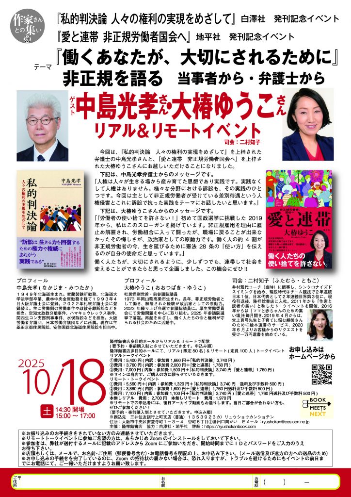 10月18日に、『私的判決論』の著者・中島光孝弁護士と大椿ゆうこさん(前参議院議員)とのトークイベントが、大阪の書店、隆祥館書店で開催されます。